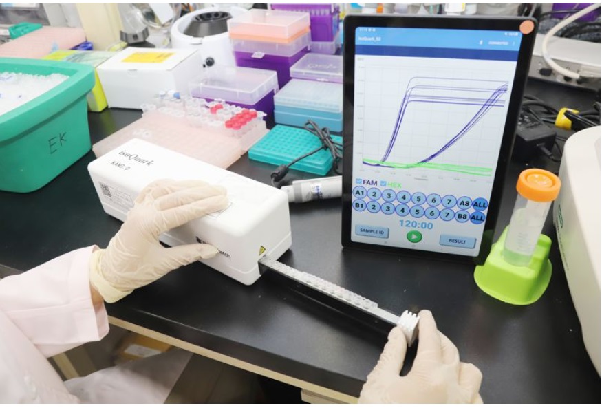 등온 증폭 기술을 기반으로 질병 진단을 위해 시료를 특정 온도로 유지하면서 실시간 증폭 확인 및 유전자와 결합된 형광물질을 검출합니다.